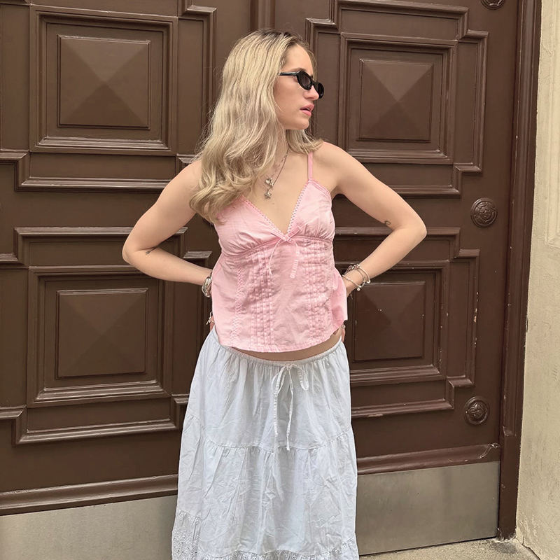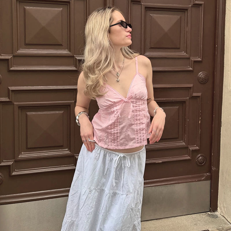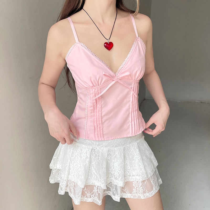 เสื้อสายเดี่ยวคอวีแต่งระบาย Sweet Girl รุ่นบางเบา สีพื้น สำหรับฤดูร้อน เสื้อครอปสำหรับผู้หญิง