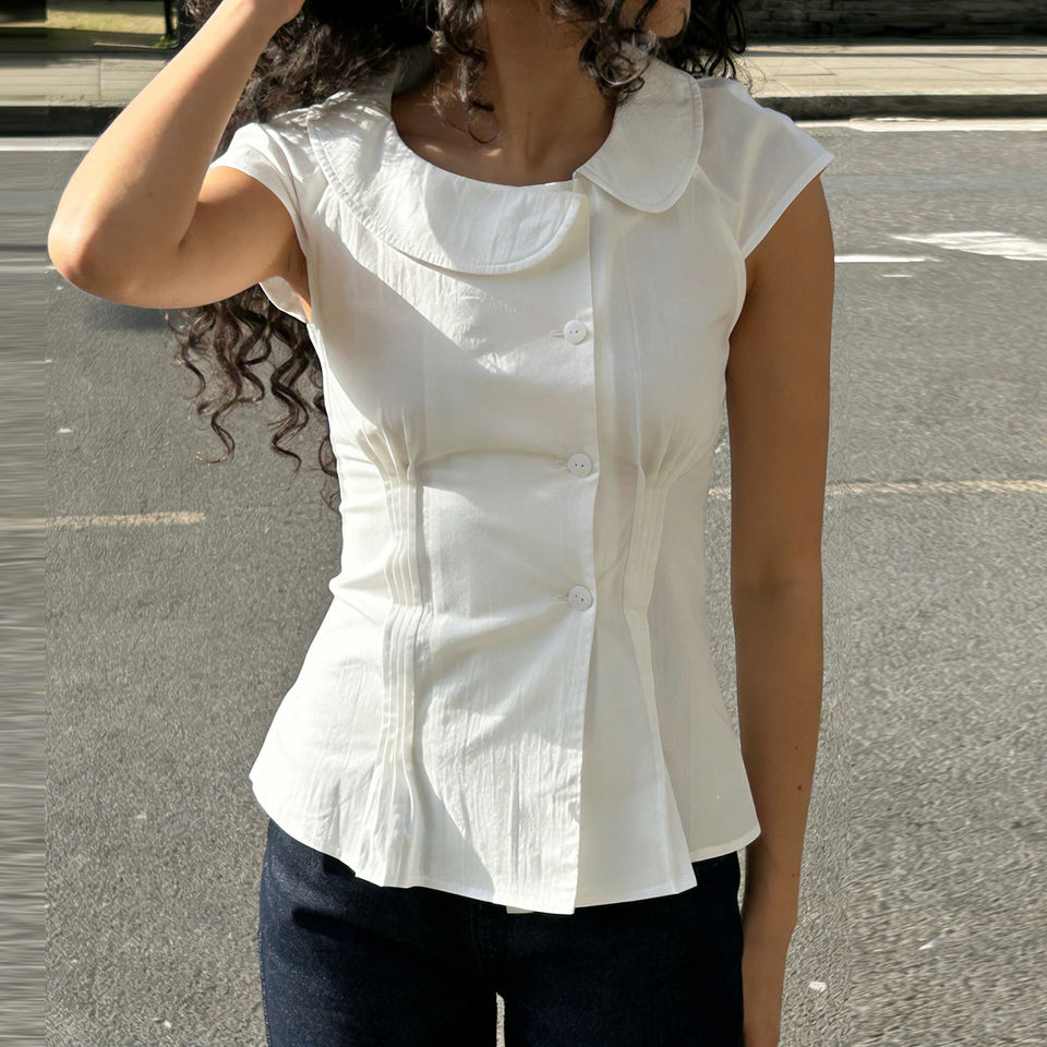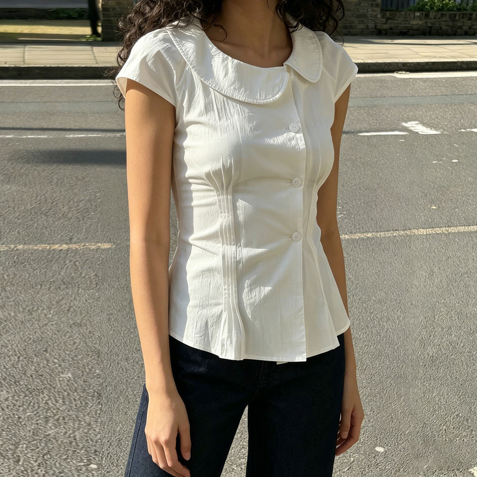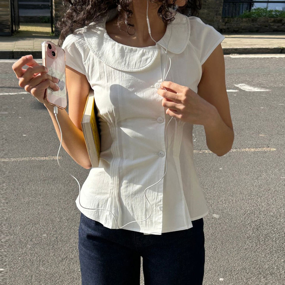 เสื้อเบลาส์สไตล์หวานๆ แบบสาวหวาน สีพื้น ปกบอดี้สูท ติดกระดุมด้านหน้า รัดเอว แต่งระบาย แนวลำลอง สำหรับวัยรุ่น น่ารัก สดใส