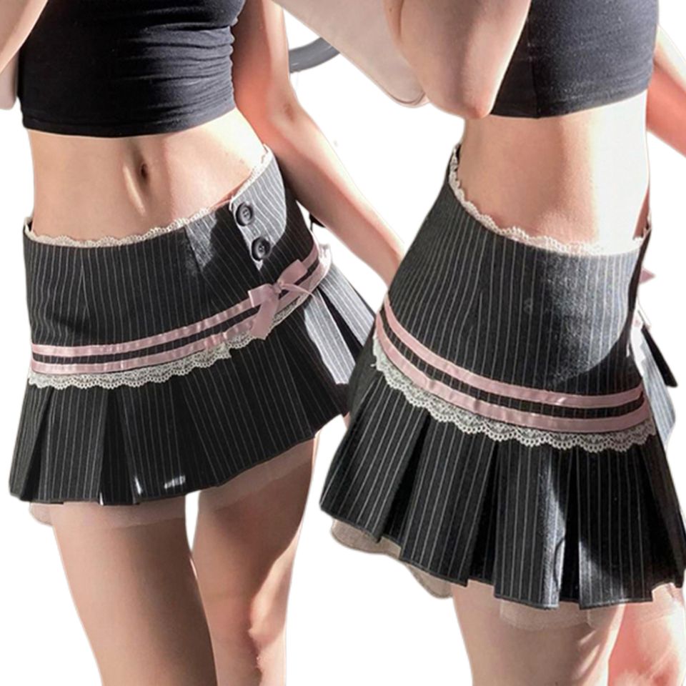 Sweet Low Rise Pleated Skirt Attached Shorts | Girly Style Featuring Lace Bow Striped Color Block | Mini Skirt Spring