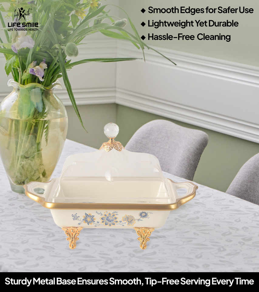 จานขนมหวานพร้อมฝาครอบใสและฐานสีทอง วัสดุทำจากโบนไชน่า คุณภาพสูง ดีไซน์หรูหราทันสมัย