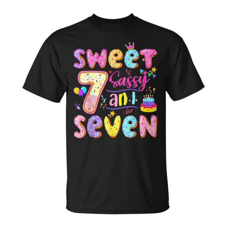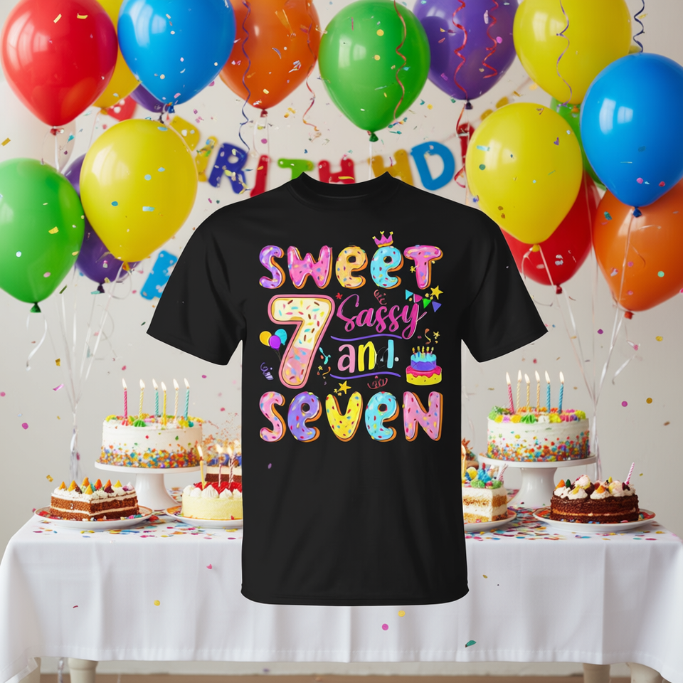 เสื้อยืดวันเกิดครบรอบ 7 ปีของเด็กผู้หญิง Sweet Sassy & Seven Girls เสื้อยืดโปรโมชั่นที่ปรับแต่งได้สำหรับเด็กอายุ 7 ขวบ