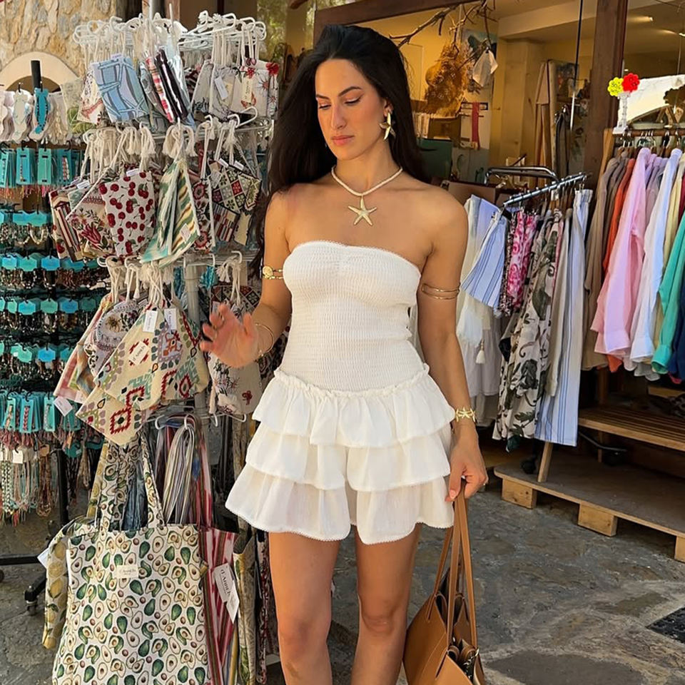 เดรสสายเดี่ยวรัดรูปทรงหวานสไตล์รัชเชอร์ ชุดมินิเดรสระบายหลายชั้นเปิดหลัง ทรงเข้ารูป ชุดน่ารักสำหรับฤดูร้อน