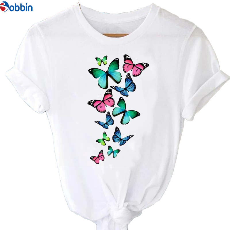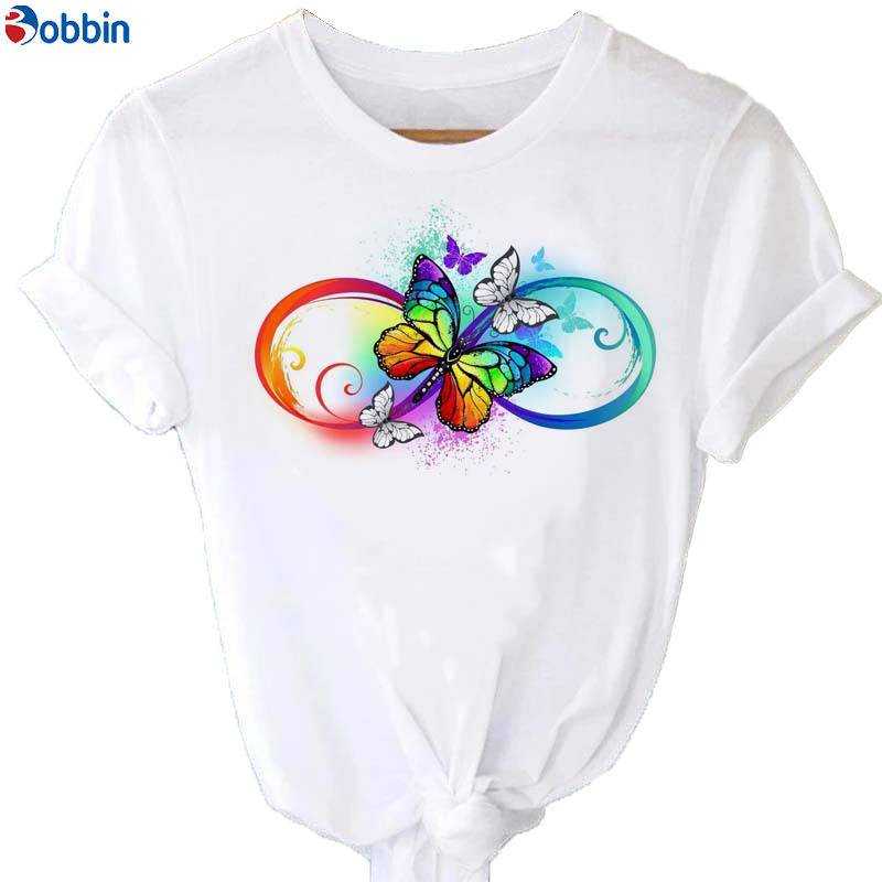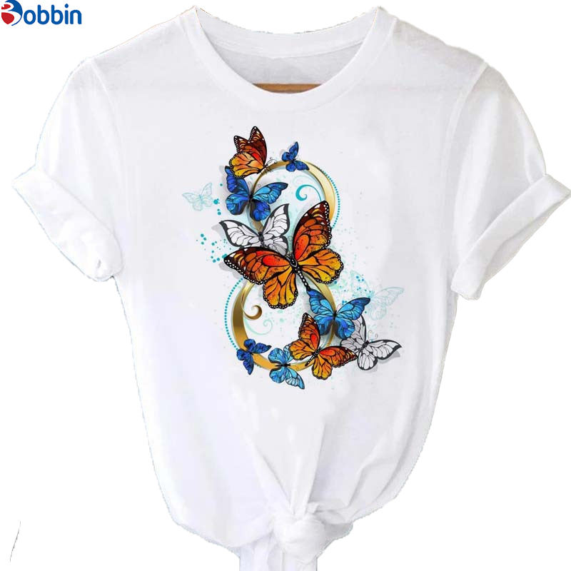 เสื้อยืดผู้หญิงลายดอกกุหลาบและผีเสื้อ สไตล์หวานๆ ทรงหลวม ระบายอากาศได้ดี แขนสั้น ตกแต่งลายกราฟิก