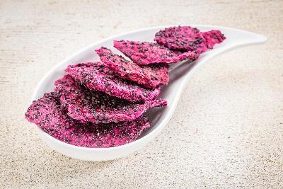 เนื้อกรอบสีสดใสลายผลไม้มังกรอบแห้งแช่แข็งจากเวียดนาม