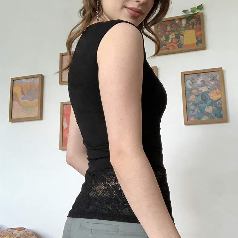 เสื้อกล้ามถักลายพิมพ์ดิจิทัลทรงเข้ารูป คอวี ผ้าลูกไม้บางเบา ระบายอากาศได้ดี สีพื้น ผ้ายืดสแปนเด็กซ์/โพลีเอสเตอร์