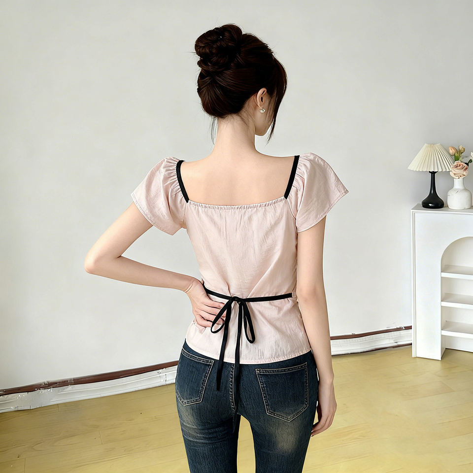 เสื้อแขนสั้นผูกเชือกสไตล์วินเทจหวานๆ เสื้อยืดทรงเข้ารูปสีตัดกันสำหรับผู้หญิงสวมใส่สบายๆ ในฤดูร้อน