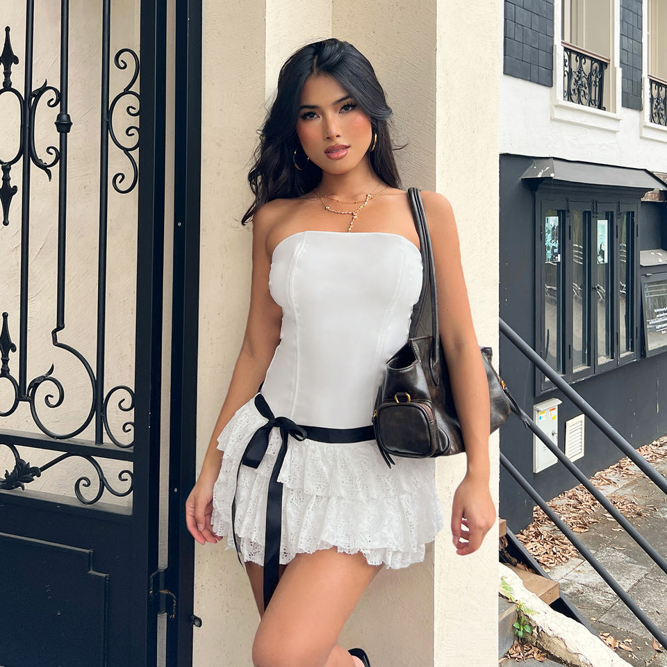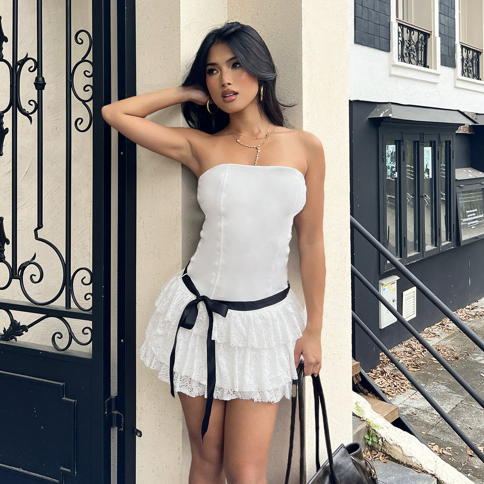 เดรสสั้นคอร์เซ็ทแบบไร้สาย แต่งผ้าลูกไม้หวานซ่อนเซ็กซี่ สไตล์วินเทจฝรั่งเศส พร้อมโบว์ผูกและกระโปรงทรงเค้กหลายชั้นสำหรับผู้หญิง