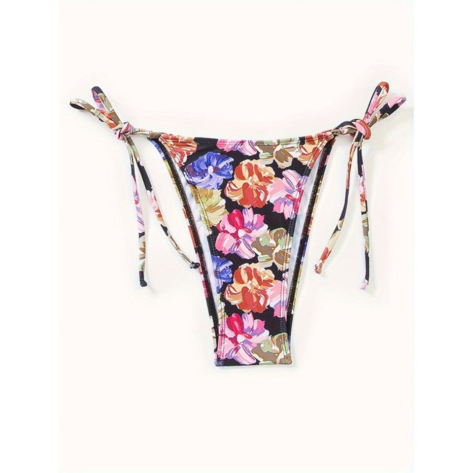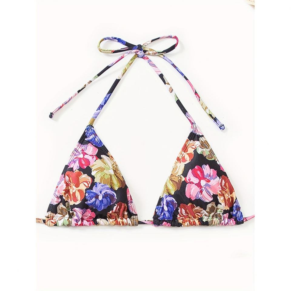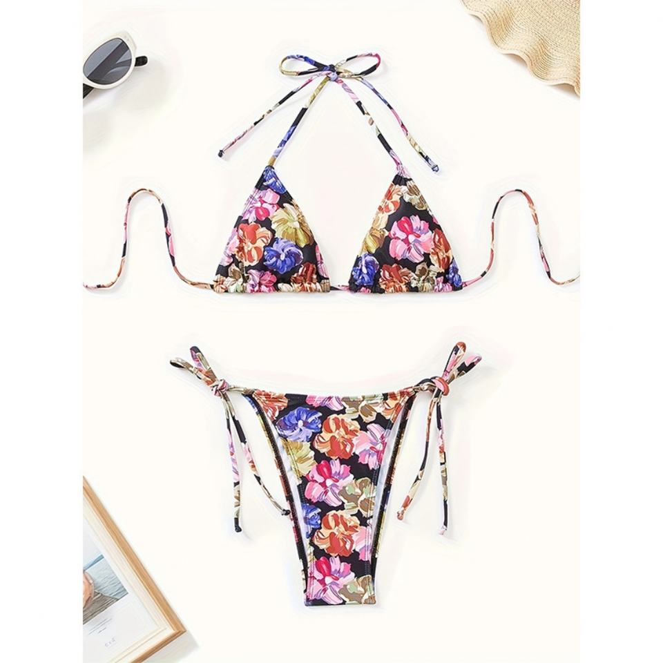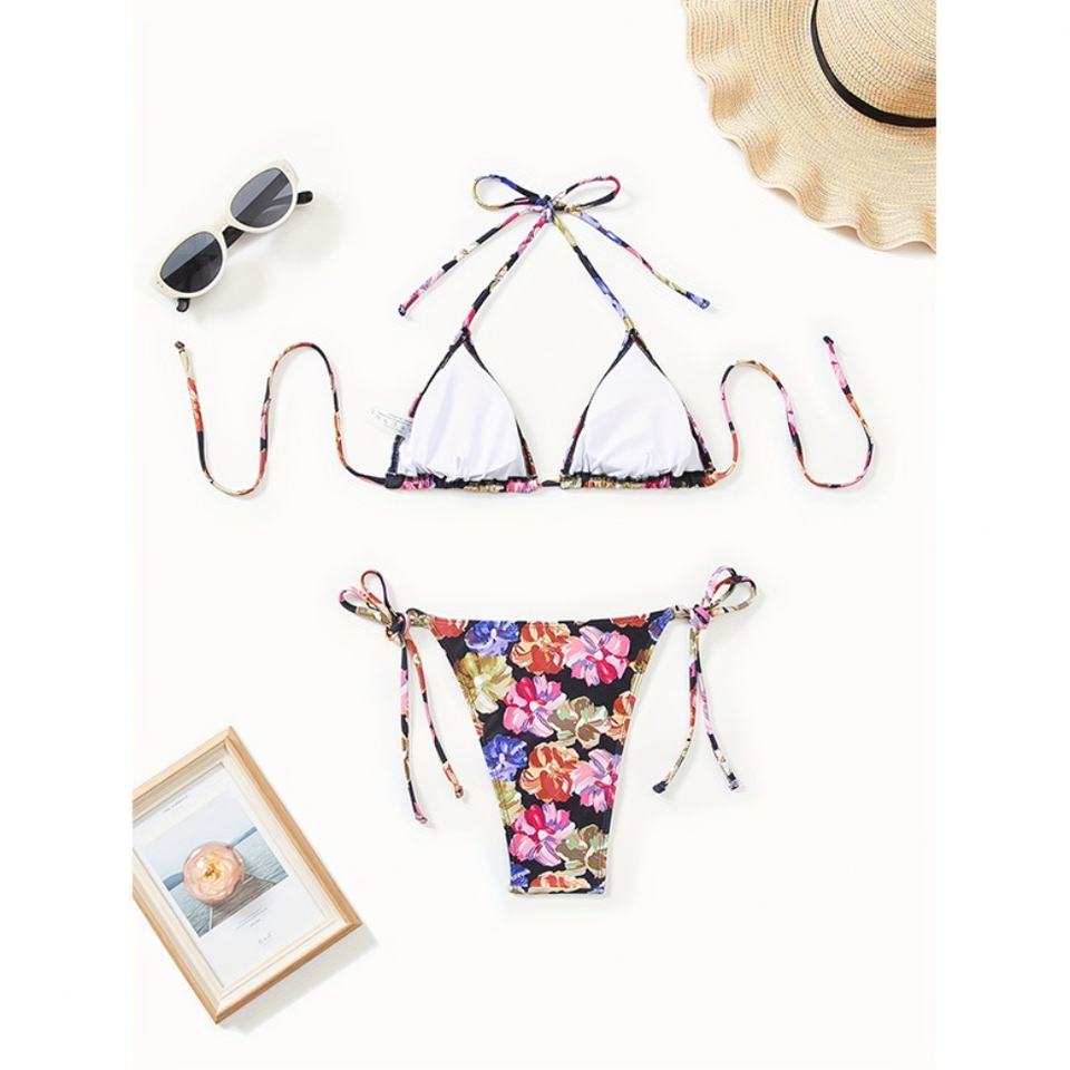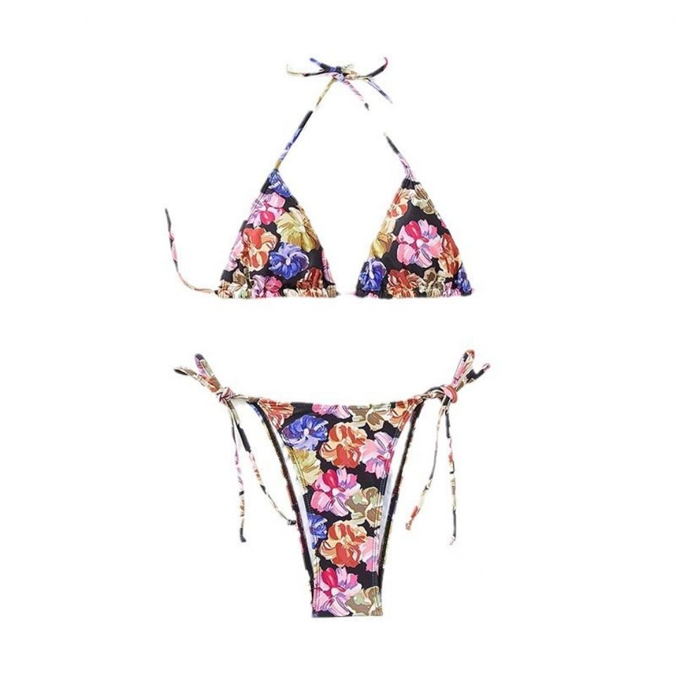 ชุดว่ายน้ำ OEM แบบผูกเชือก ลายดอกไม้ โลโก้สั่งทำได้ คอวี ดีไซน์โดดเด่น สีม่วง เสื้อผ้าผู้หญิง บิกินี่ ชุดว่ายน้ำ