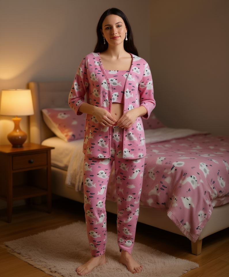 ชุดนอนผ้าฟลีซสำหรับผู้หญิง Sy298r แขนสามส่วน ลายสัตว์ เนื้อผ้านุ่ม ชุดนอนฤดูหนาวขายาว เอวกลาง