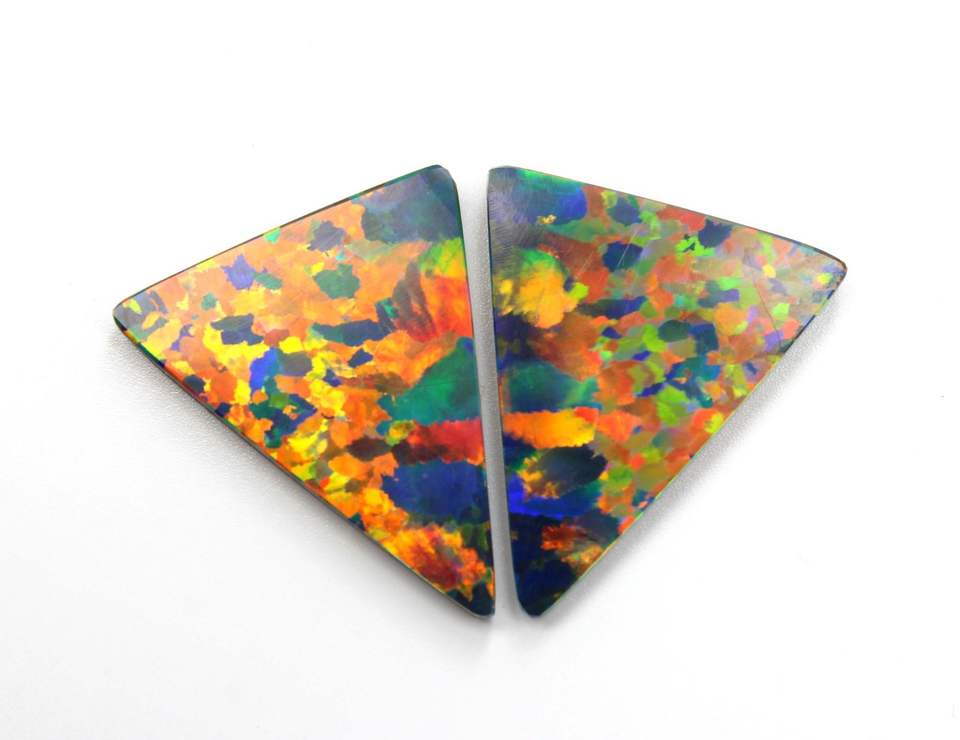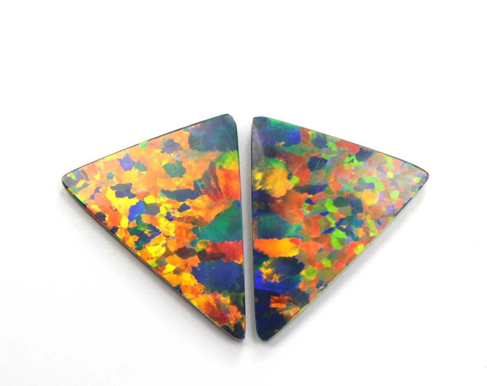 โอปอลสังเคราะห์คู่เหมือนกัน โอปอลเบลโลสีดำ รูปทรงทริลเลียน พลอยหลวม ขนาด 29x23 มม. น้ำหนัก 35 กะรัต