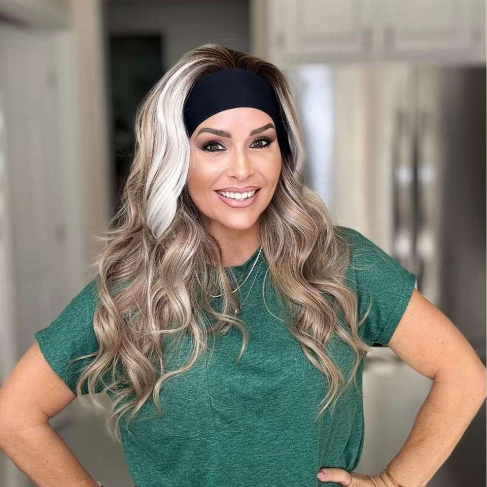 วิกผมสังเคราะห์แบบคาดศีรษะ ลอนยาวหยักศก สีน้ำตาลประกายบลอนด์ พร้อมเชือกผูกแบบใส ทนความร้อน สำหรับผู้หญิง ใช้ได้ทุกวัน คอสเพลย์