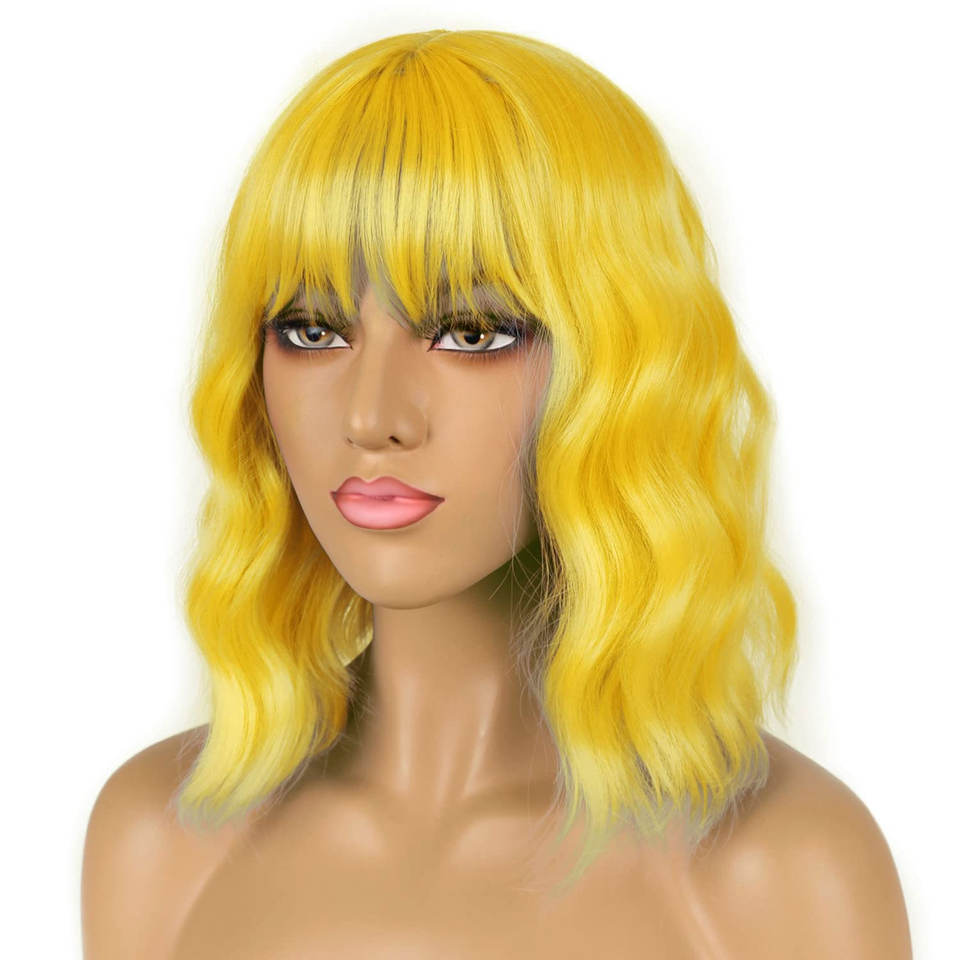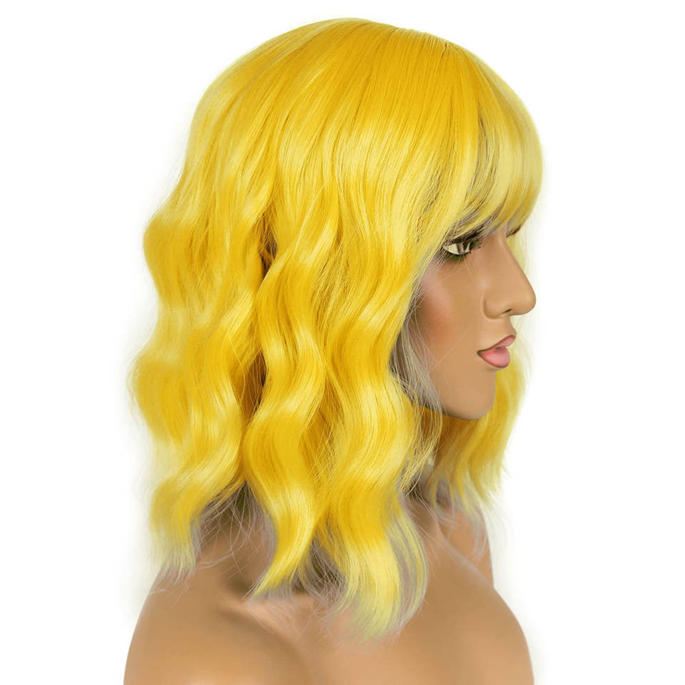 วิกผมบ๊อบสั้นสังเคราะห์ที่มีผมม้าสำหรับผู้หญิงผมหยิกยาวสะพายไหล่สีสดใสทนความร้อนสำหรับคอสเพลย์สีเหลือง