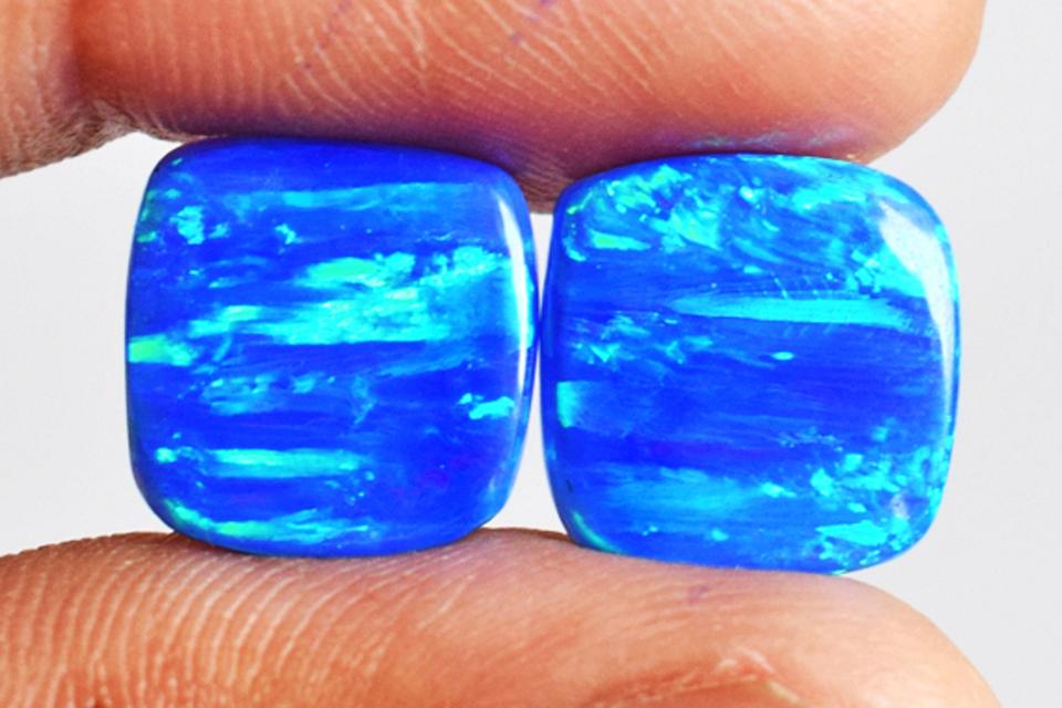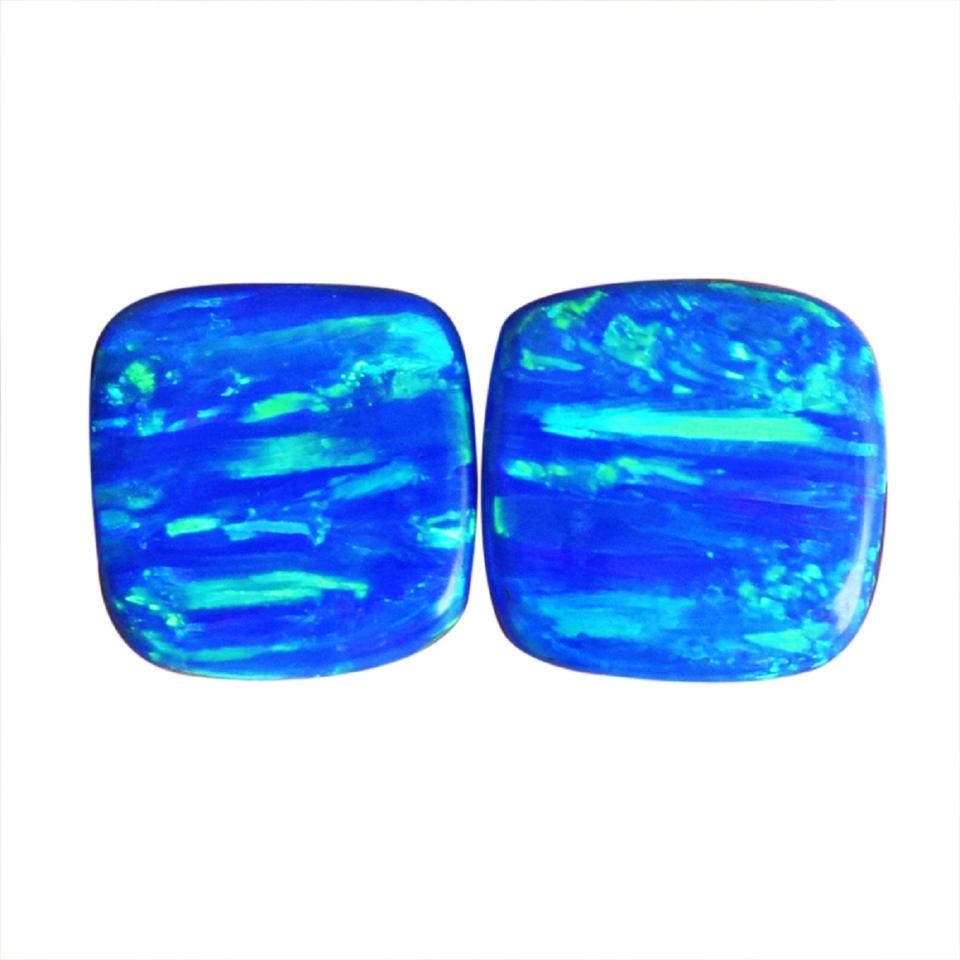 โอปอลสีน้ำเงินเขียวประกายไฟสังเคราะห์คู่ ขนาด 11x11x2 มม. รูปทรงคุชชั่น เหมาะสำหรับทำเครื่องประดับและบำบัดรักษา