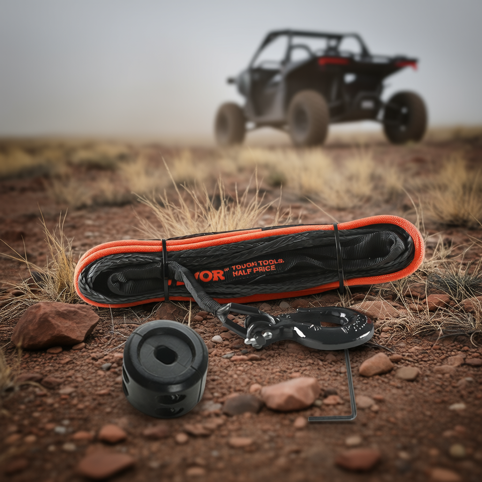 เชือกกว้านสังเคราะห์ขนาด 3/16 นิ้ว x 50 ฟุต พร้อมปลอกป้องกัน ตะขอแบบฟอร์จ ใช้ได้กับรถ ATV UTV สายรัดลากจูง