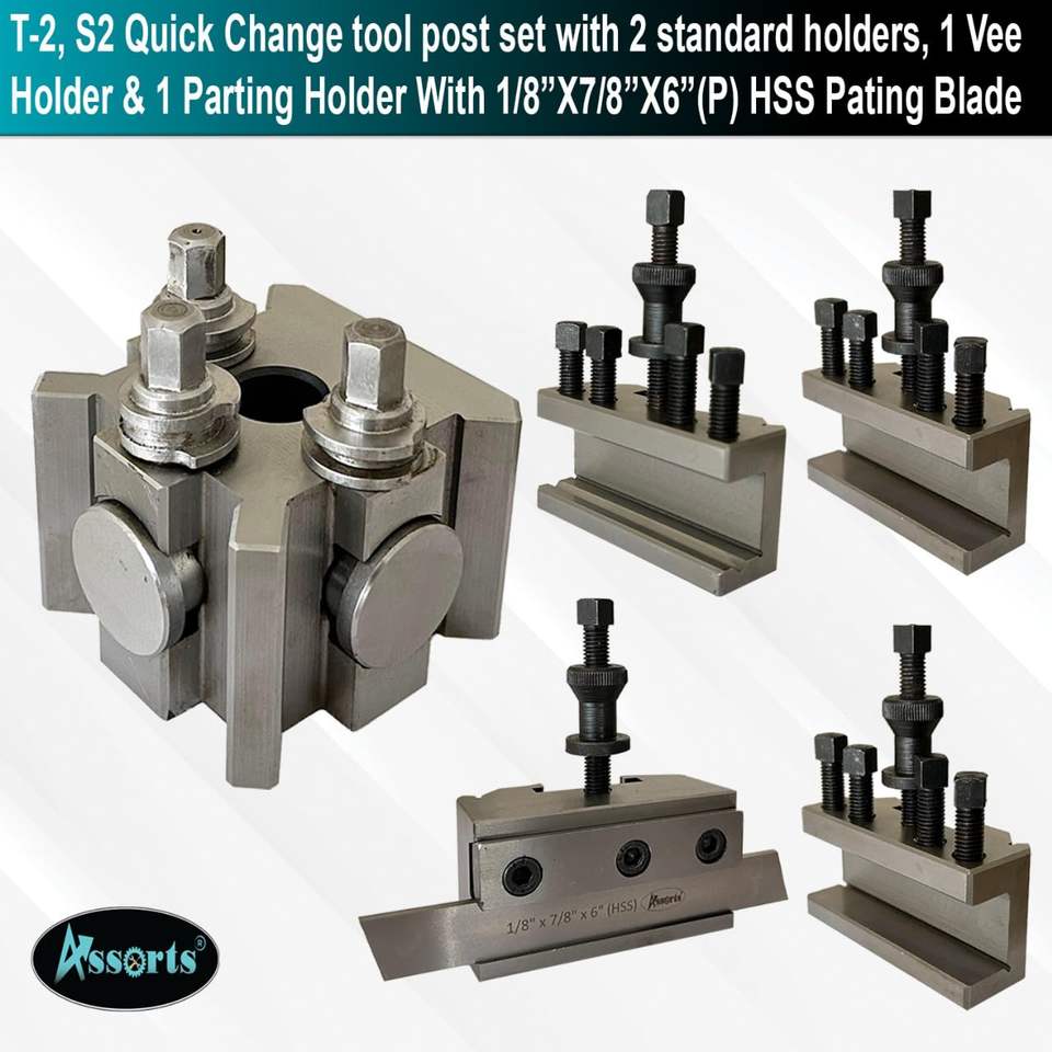 ชุดแท่นจับเครื่องมือเปลี่ยนเร็ว T-2 S2 พร้อมที่จับมาตรฐาน 2 อัน ที่จับแบบวี 1 อัน ที่จับแบบแบ่งชิ้นส่วน (1/8 นิ้ว x 7/8 นิ้ว) - สภาพใหม่