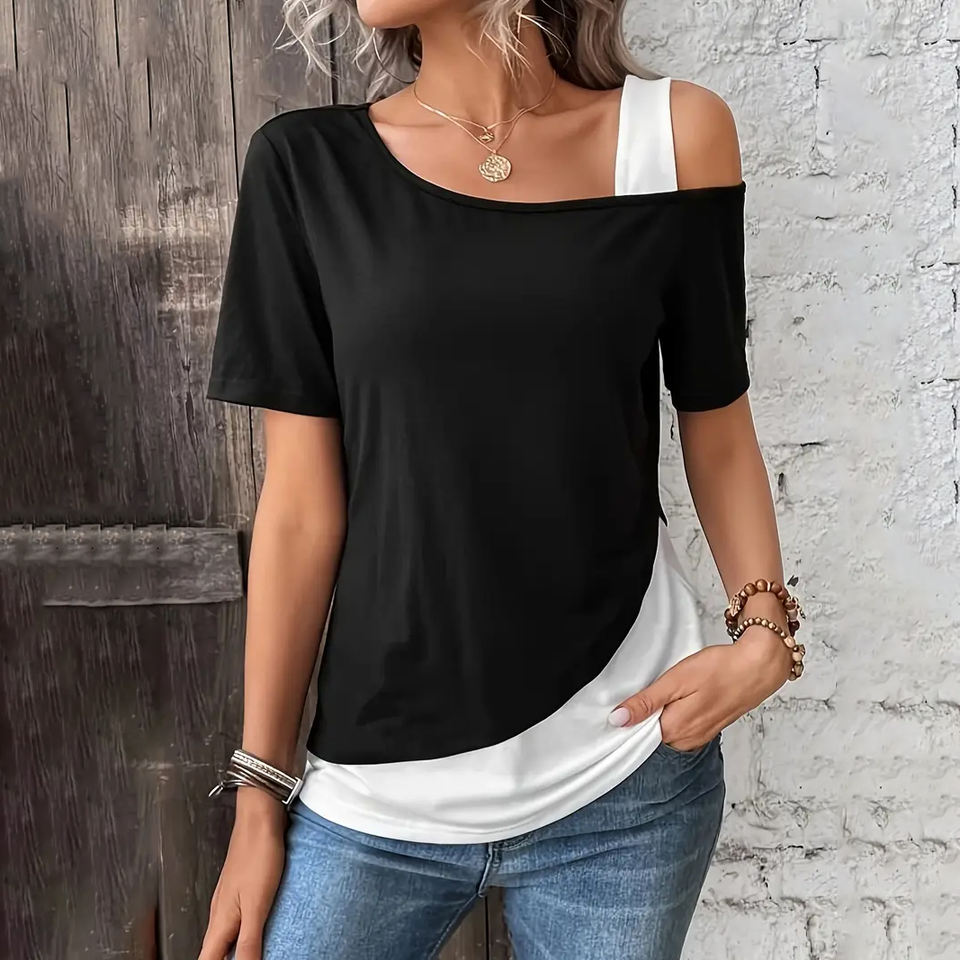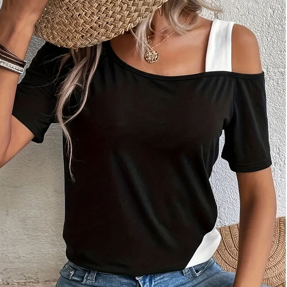 เสื้อยืดเปิดไหล่เสื้อผู้หญิงน้ำหนักเบาระบายอากาศได้ดีผ้าลำลองฤดูใบไม้ผลิฤดูร้อน