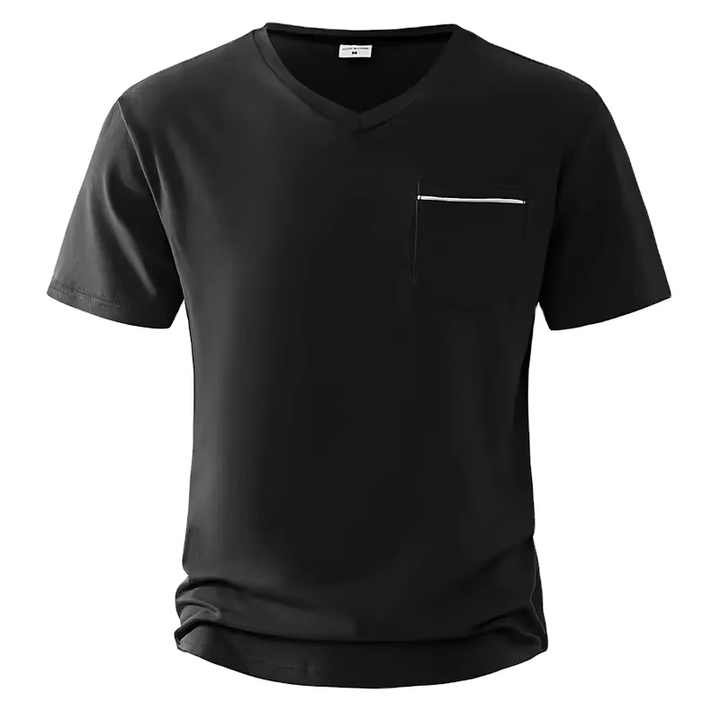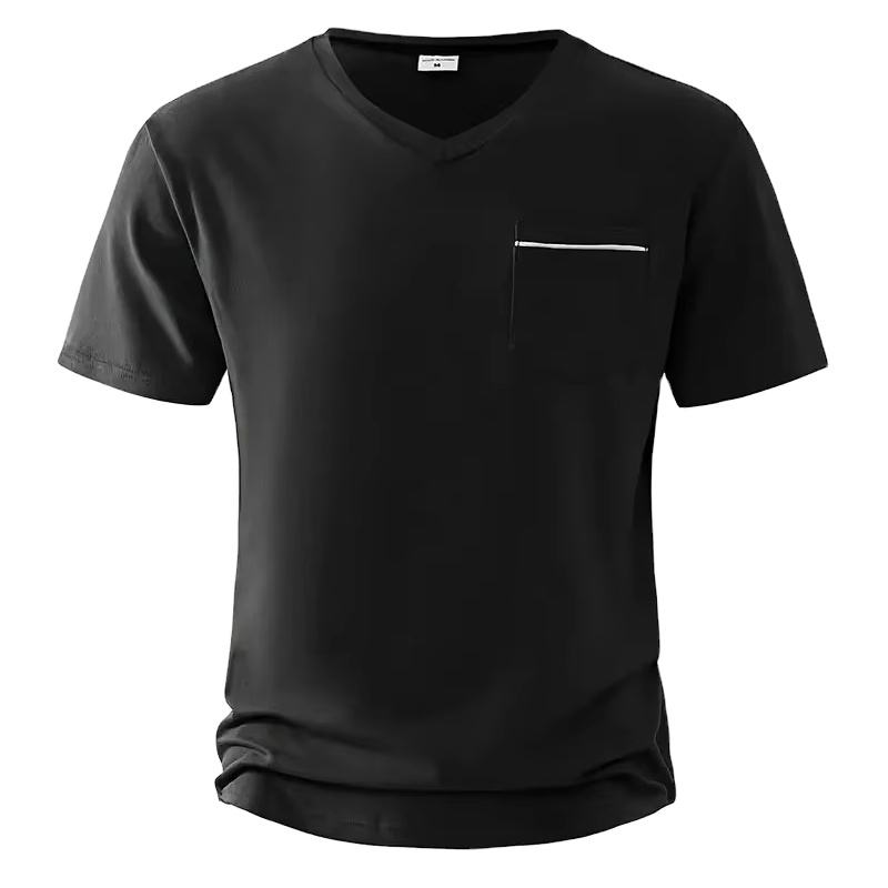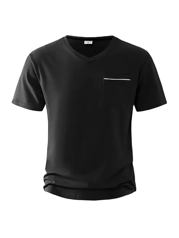 เสื้อยืดแขนสั้นคอวีลำลองสำหรับผู้ชายมีกระเป๋าหน้าอกลายเรขาคณิตผ้ายืดขนาดกลางซักได้ทุกฤดู