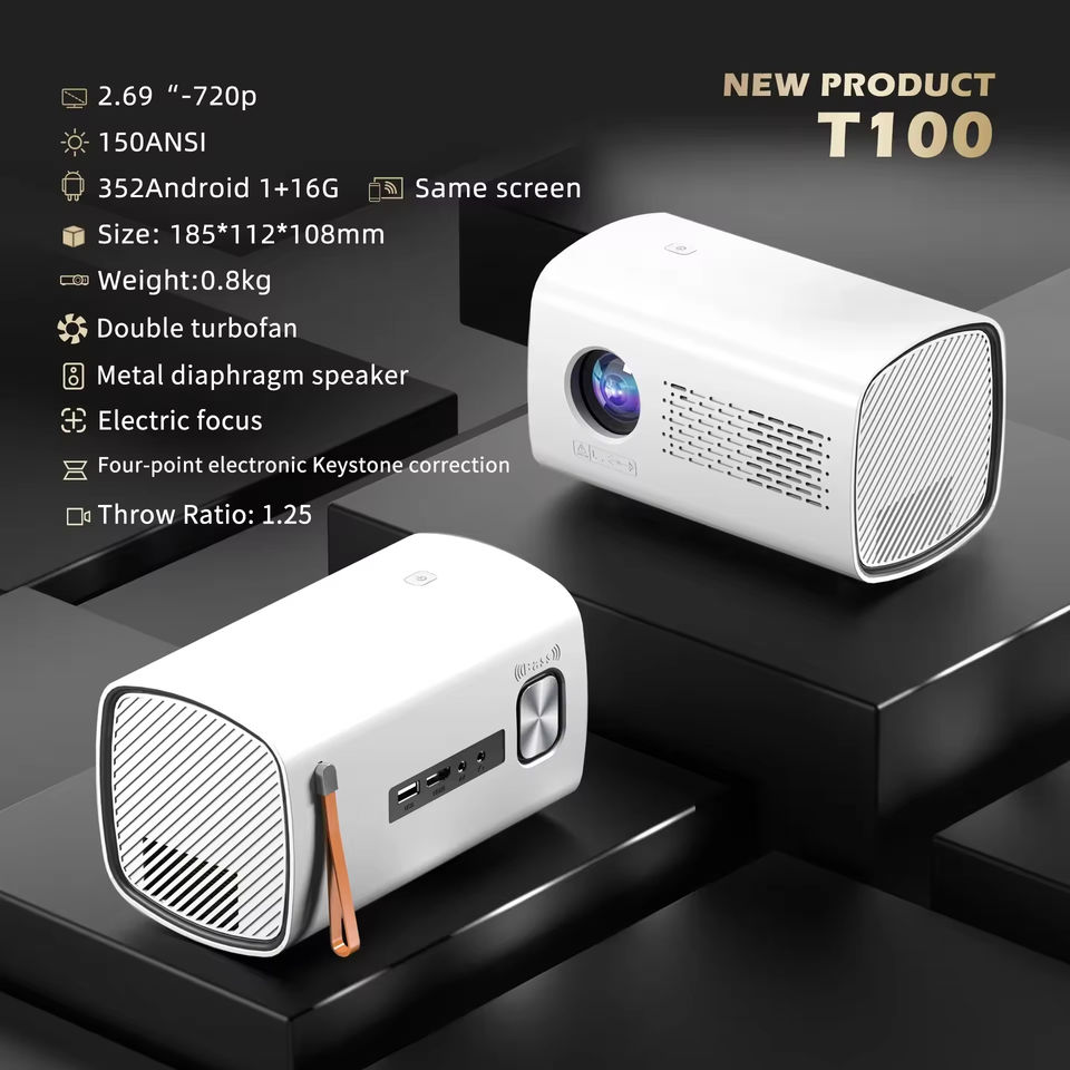 โปรเจคเตอร์พกพาอัจฉริยะ T100 720P Full HD สำหรับใช้งานกลางแจ้ง ระบบ Android 9.0 รองรับ 5G WiFi โปรเจคเตอร์โฮมซีนีม่าไร้สาย LED