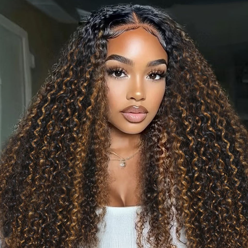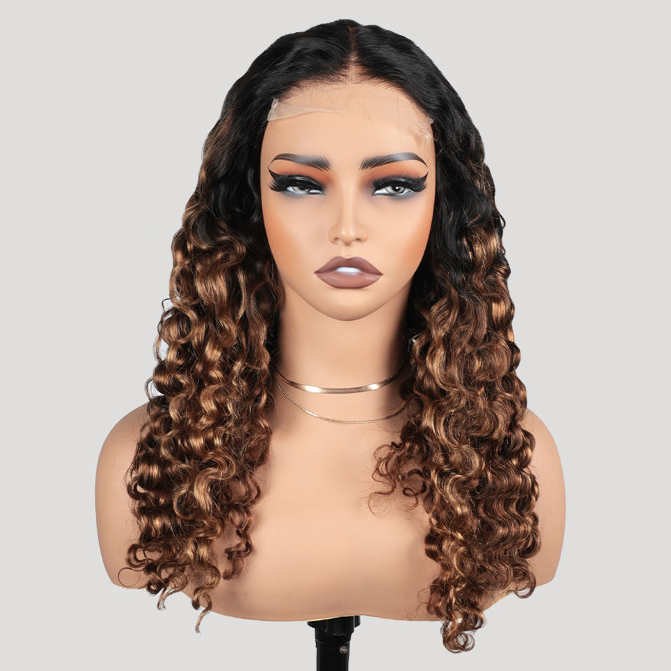 T1B/427 # วิกผมมนุษย์แท้แบบไม่ต้องใช้กาว ทรงลอนใหญ่แบบพม่า ขนาด 5x5 ปมฟอกสี วิกผมลูกไม้ด้านหน้า ไฮไลท์แบบออมเบรและลอนผมหนา