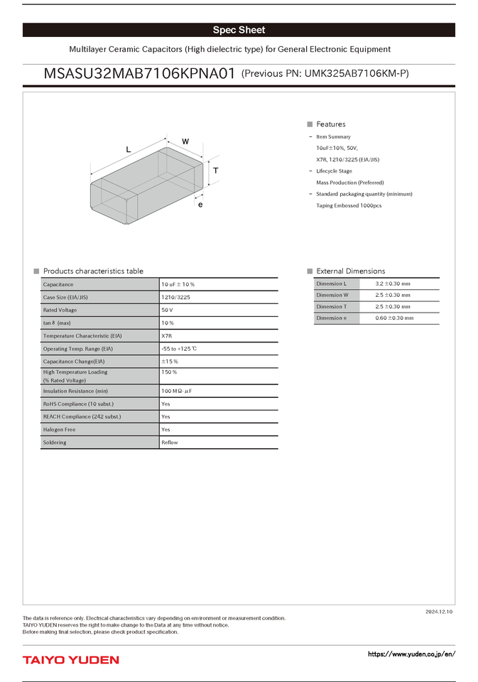 ลักษณะ:SMT 1210/3225 X7R 10UF 50V ±10% 1K/อาร์