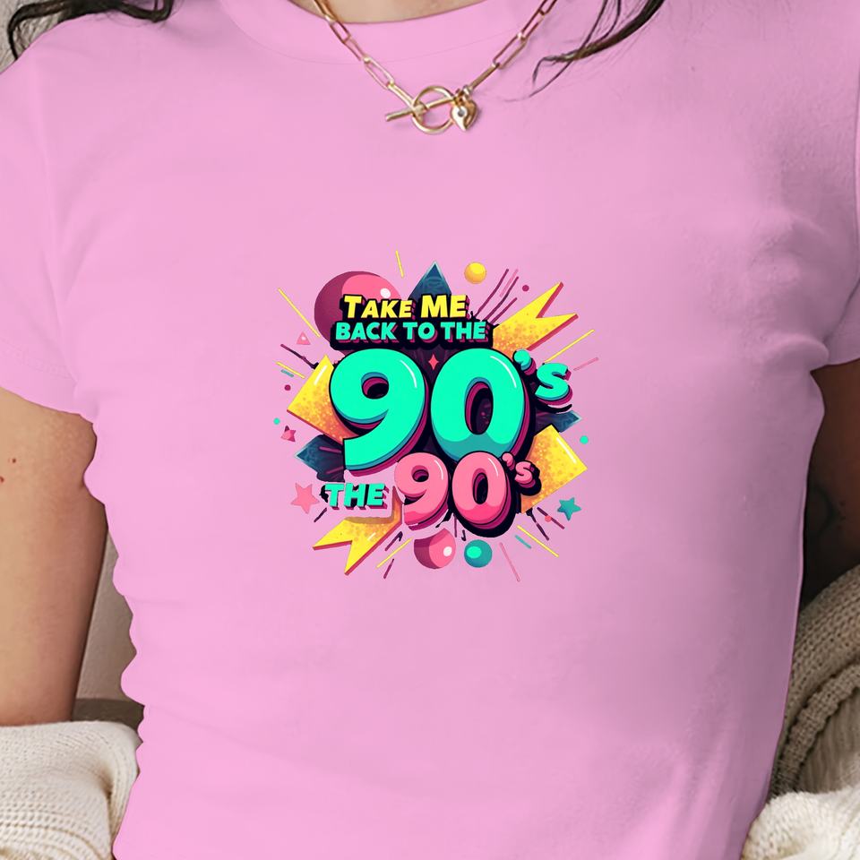 พาฉันกลับไปย้อนยุคยุค 90 เสื้อยืดแขนสั้นพิมพ์ลายทรงเข้ารูปสำหรับผู้หญิงสไตล์ Y2K