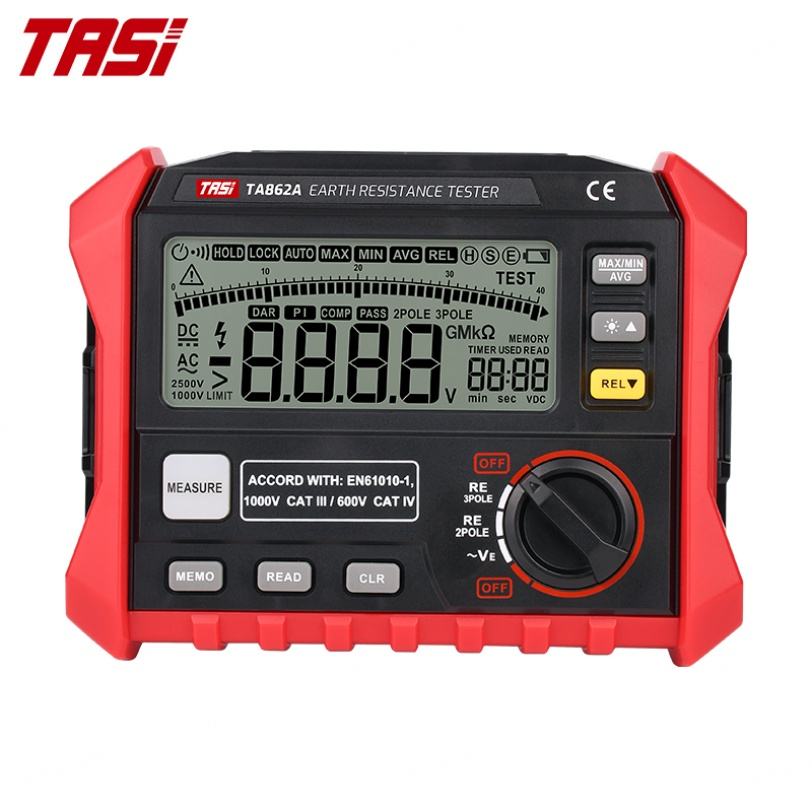 เครื่องทดสอบความต้านทานดินแบบดิจิตอลคุณภาพสูง TASI TA862A รุ่นใหม่ พร้อมจอแสดงผลความต้านทานดินแบบ 2 ขั้ว และ 3 ขั้ว