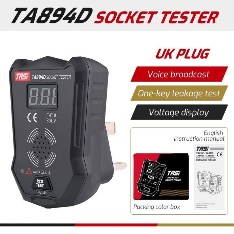 Tasi TA894D 175V ~ 250V ตัวทดสอบแรงดันไฟฟ้าเครื่องทดสอบเสียง RCD GFCI ปลั๊กสหราชอาณาจักรเครื่องทดสอบเต้ารับติดผนังจอแสดงผลดิจิตอล (2.0% + 2)