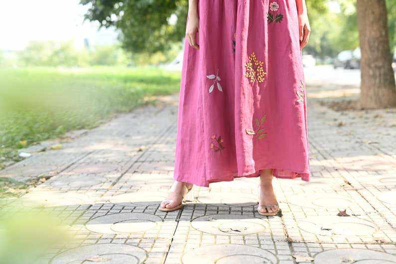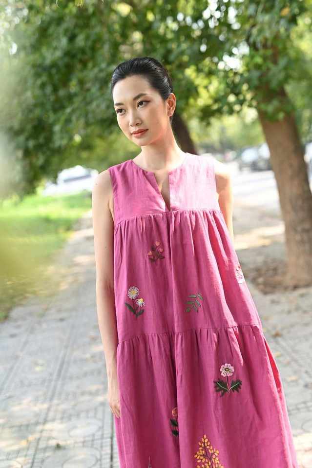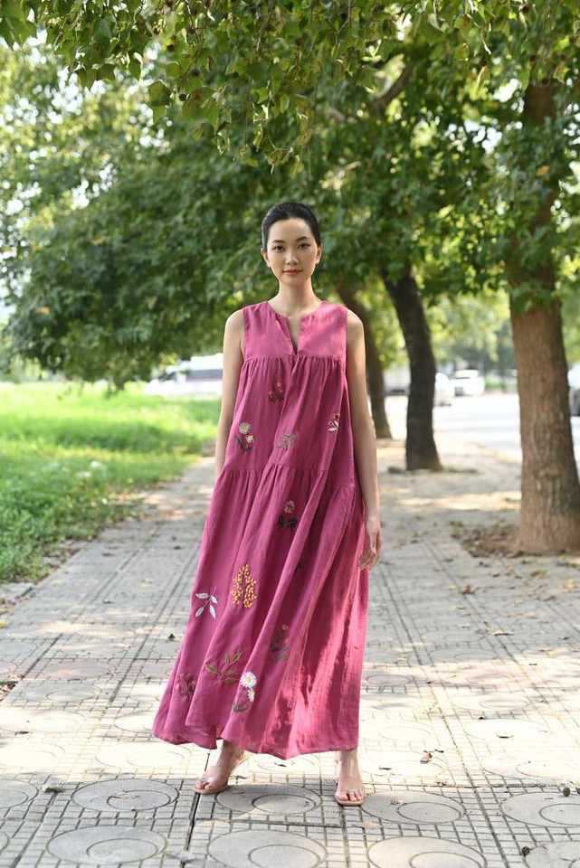 Taylor Trapeze ชุดผ้าลินิน Maxi แขนกุดงานแต่งงานงานปักทำมือสำหรับผู้หญิงชุดฤดูร้อน