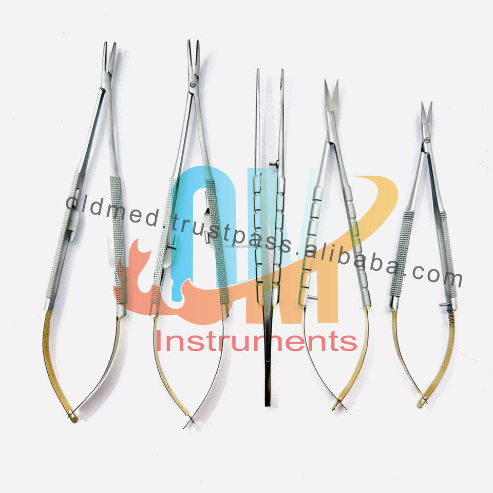 ชุดเครื่องมือไมโคร TC Castroviejo ประกอบด้วย กรรไกร ที่จับเข็ม คีมเย็บแผลตรง คีมผูกไหมเย็บ คุณภาพทางการแพทย์เยอรมัน สำหรับงานทันตกรรมและศัลยกรรมตา