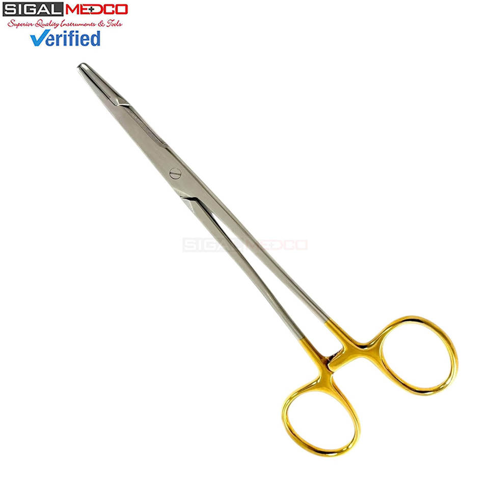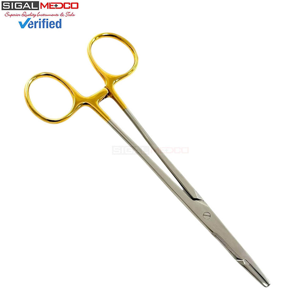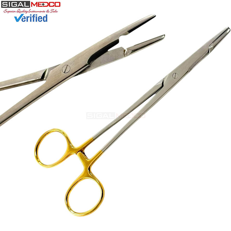 ที่จับเข็ม TC Olsen Hegar ขนาด 6.5 นิ้ว พร้อมหัวทังสเตนคาร์ไบด์ ด้ามจับสีทอง แบบวงแหวน ล็อคด้วยระบบแร็ทเช็ต ทำจากสแตนเลสสตีล สำหรับการผ่าตัด