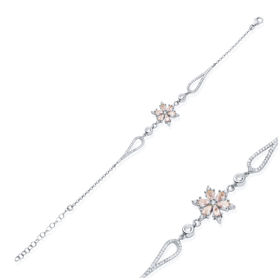 สร้อยข้อมือเงินแท้ 925 ชุบโรเดียม ประดับด้วยพลอย CZ สีชมพู ดีไซน์ดอกบัว THEIA งานแฮนด์เมด เครื่องประดับสำหรับผู้หญิง