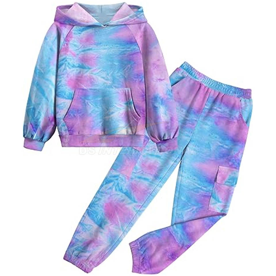 ชุดวอร์ม2ชิ้นมัดย้อมสำหรับเด็กผู้หญิงชุดวอร์มเสื้อสเวตเตอร์แขนยาวพร้อมกระเป๋าดีไซน์แบบมัดย้อม
