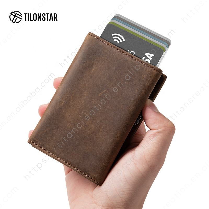 Tilonstar TVC302c ที่ใส่บัตรหนังวัวแท้แบบบางสำหรับผู้ชายกระเป๋าสตางค์อะลูมิเนียมแบบปิดกั้นการสะท้อนบัตรเครดิตป๊อปอัพสำหรับทุกวัน