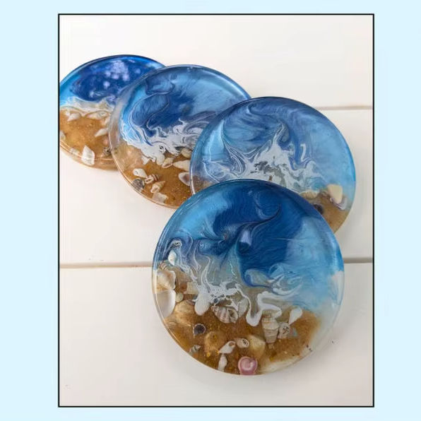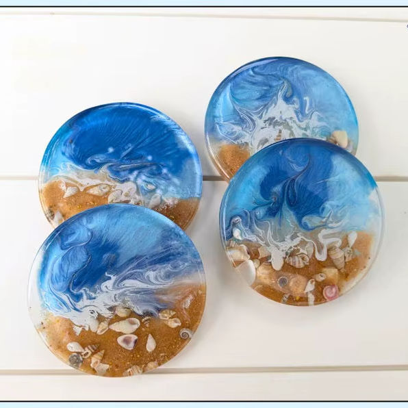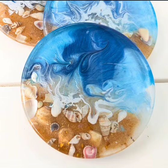 งานฝีมือเหนือกาลเวลา แผ่นรองแก้วเรซิ่นทรงกลมสำหรับชายหาด ทำมือ เป็นมิตรกับสิ่งแวดล้อม สีและขนาดตามสั่ง ของตกแต่งบ้าน ของขวัญสำหรับคริสต์มาส