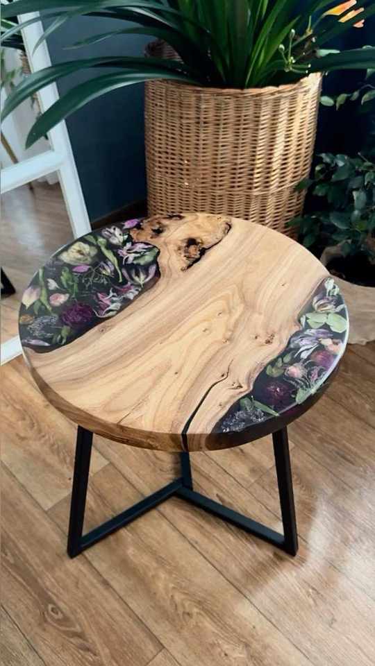 งานฝีมือเหนือกาลเวลา โต๊ะเรซิ่นรักษ์โลก ประดับด้วยงานศิลปะอีพ็อกซี่ลายดอกไม้ สีตามสั่ง รูปทรงธรรมชาติ ของตกแต่งบ้าน