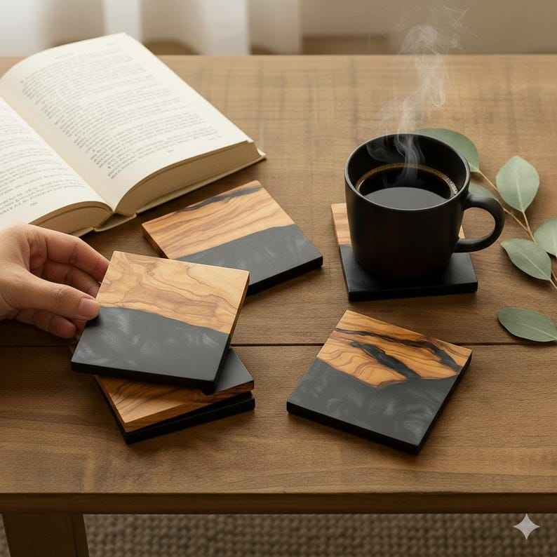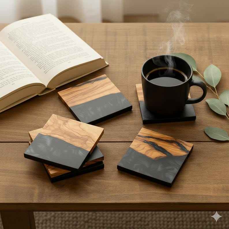 ชุดจานรองแก้วเรซิ่นทรงกลมสีดำ งานแฮนด์เมด ทาสีด้วยมือ เป็นมิตรกับสิ่งแวดล้อม สไตล์เรียบง่ายทันสมัย ยี่ห้อ TIMELESS CRAFT