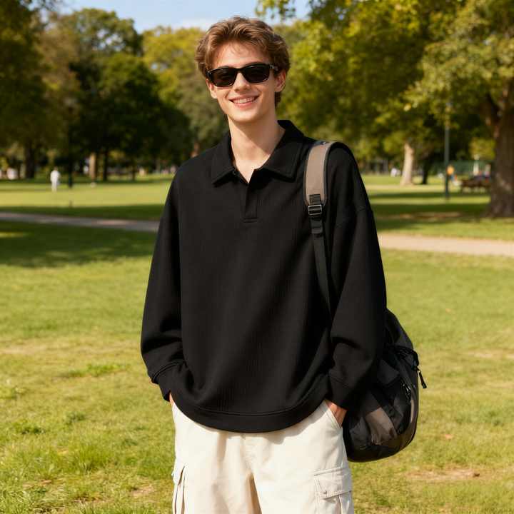 เสื้อสเวตเชิ้ตผู้ชายคอโปโลผ้าฝ้ายสีทึบแนวสตรีทแวร์ผ้าคอตตอน100% โอเวอร์ไซส์สำหรับ TKAN419D ออกแบบได้ตามต้องการ