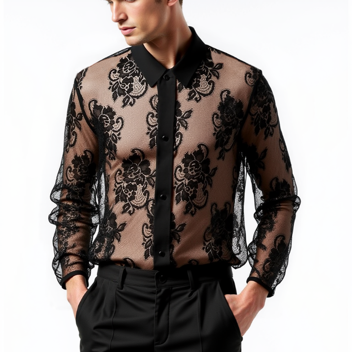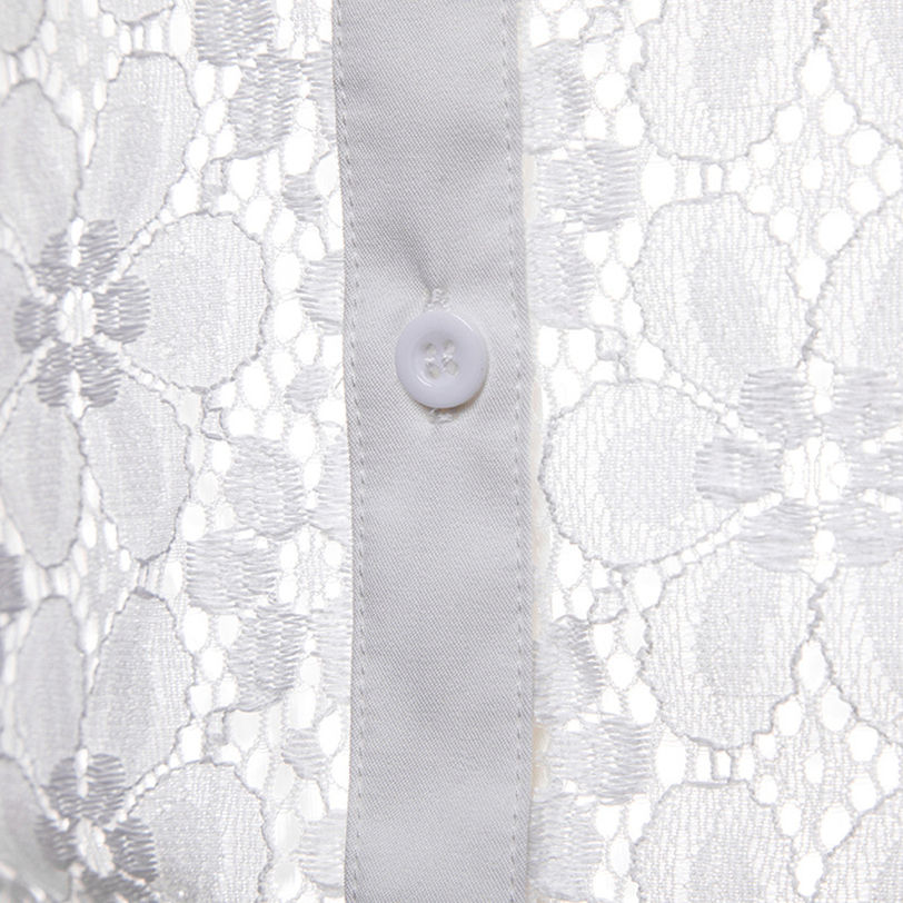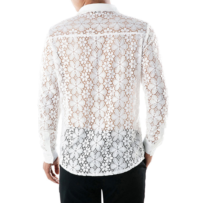 TKAN689 Vintage Lace Shirt White See Through Rose Flower Lace Pattern Shirt Turn-down Collar Full Sleeve Fashion Streetwear Top