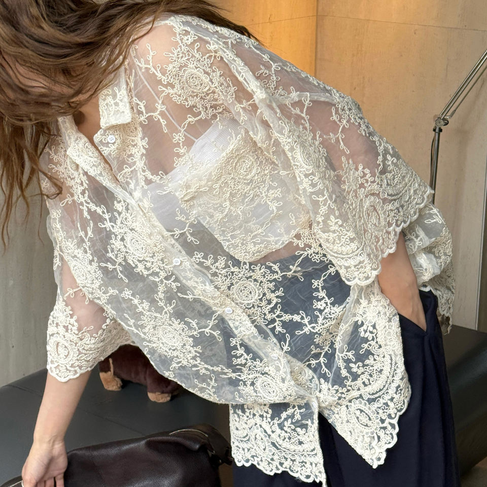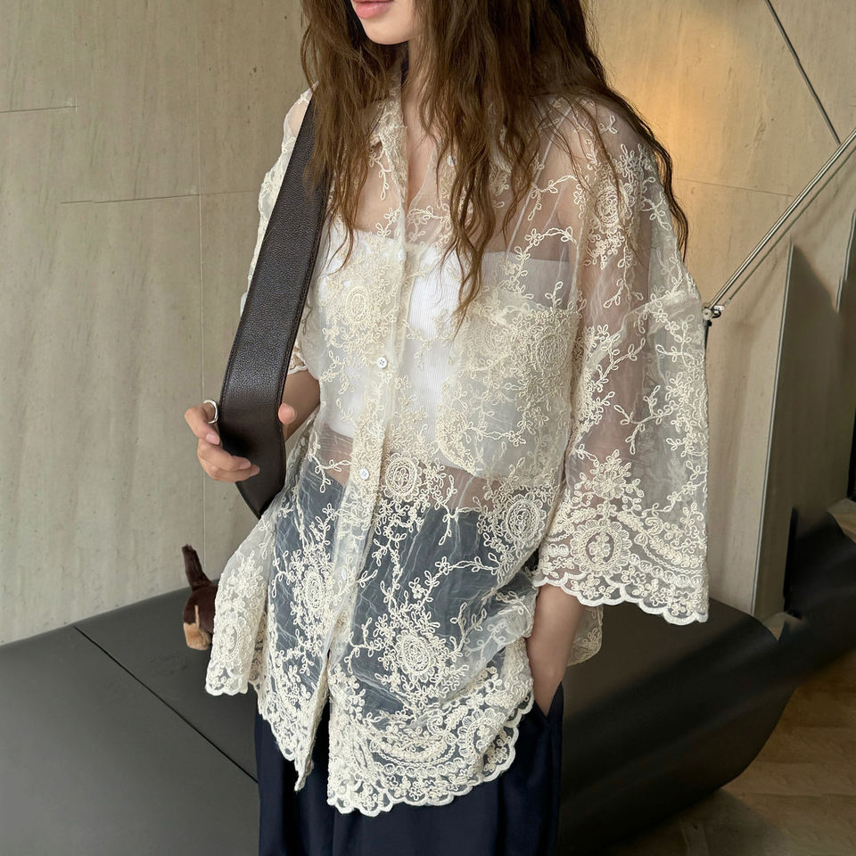 เสื้อถักโครเชต์ติดกระดุมสำหรับผู้หญิงเสื้อลูกไม้ลำลองแขนสั้นสำหรับฤดูร้อน TKAN722