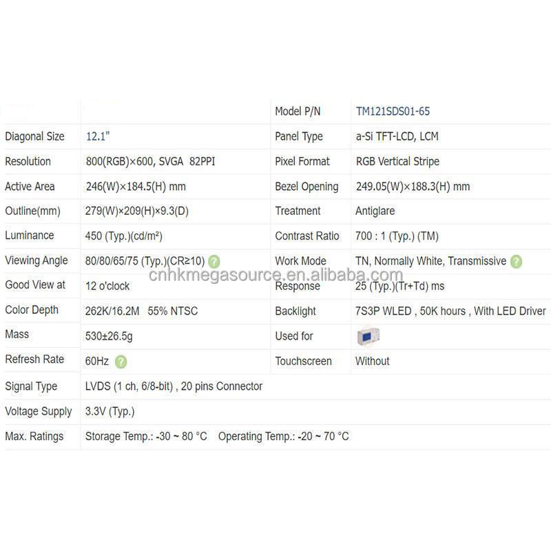 TM121SDS01-65ใหม่12.1นิ้ว TM121SDS01-65แสดงผล LCD ขนาด800*600