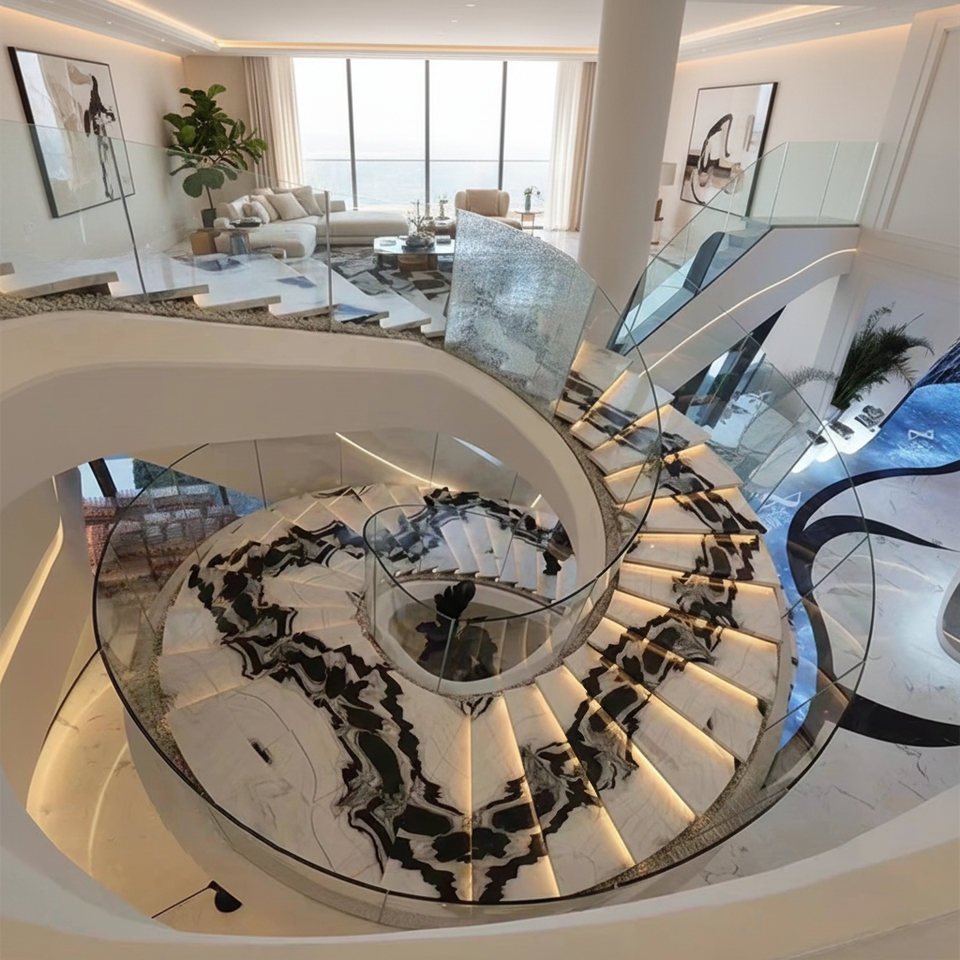 บันไดหินอ่อนธรรมชาติแบบลอยตัวทรงตรง รุ่น Goldtop OEM/ODM ผลิตตามสั่ง สำหรับตกแต่งภายในสไตล์โมเดิร์น สีขาวแพนด้า ขัดเงา แผ่นใหญ่