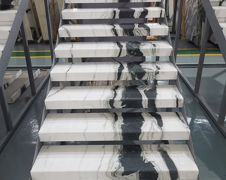 TMZ OEM/ODM หินอ่อนแพนด้าไวท์ มาร์เบอร์ หินอ่อนสีขาวธรรมชาติยอดนิยม พร้อมลายเส้นสีดำ กระเบื้องปูพื้นหินอ่อนสำหรับบันได