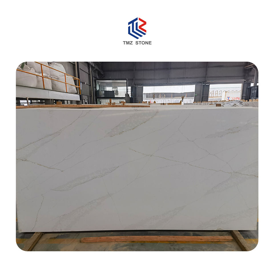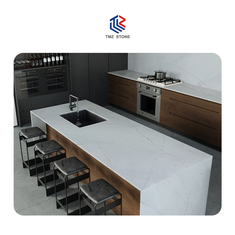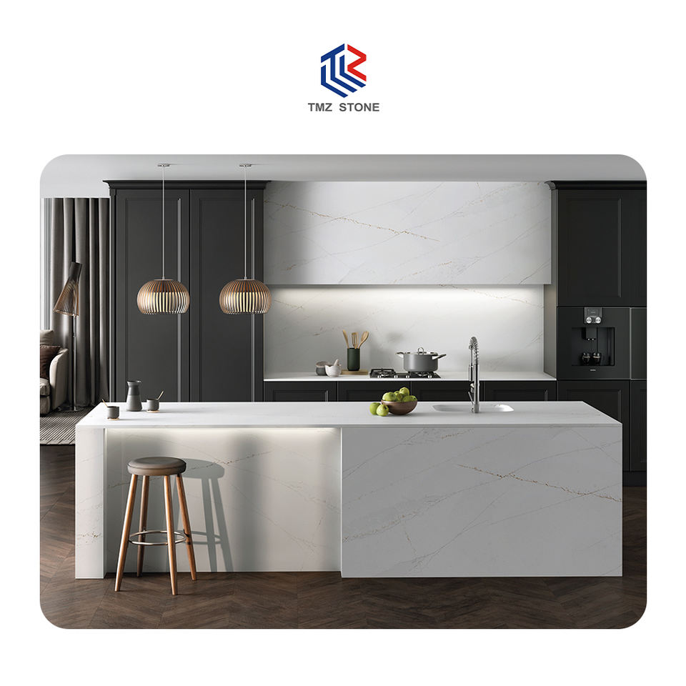 TMZ 5001ซิลิกอนเคลือบเงาต่ำ Calacatta Ethereal แผ่นหินควอตซ์แบบวิศวกรรมเคาน์เตอร์ห้องครัวที่ทันสมัยใช้งานกลางแจ้ง