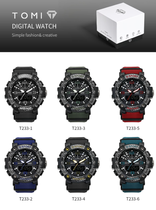 นาฬิกาข้อมือดิจิตอลกันน้ำ TOMI 233 รุ่นใหม่สำหรับผู้ชาย นาฬิกาอิเล็กทรอนิกส์ฟิตเนสสำหรับผู้ชาย นาฬิกาสปอร์ตอเนกประสงค์ กล่องของขวัญสำหรับเด็ก