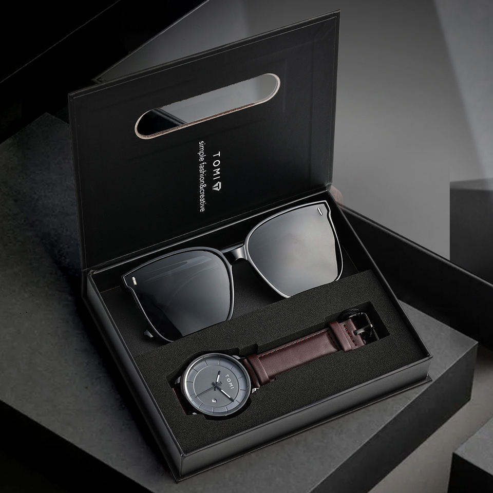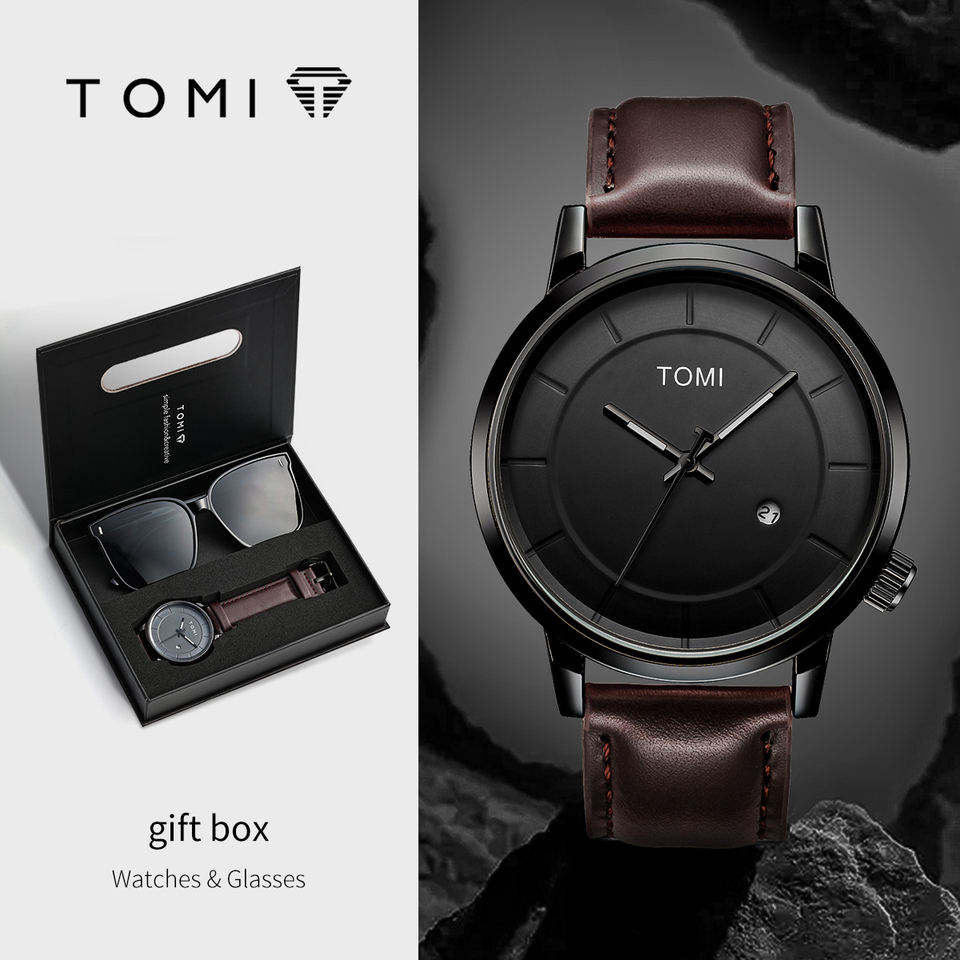 TOMI Luxury Men Watch Gift Set Quartz Movement Wrist Watch with Sunglasses Fashion Casual Gift Box Set for Men