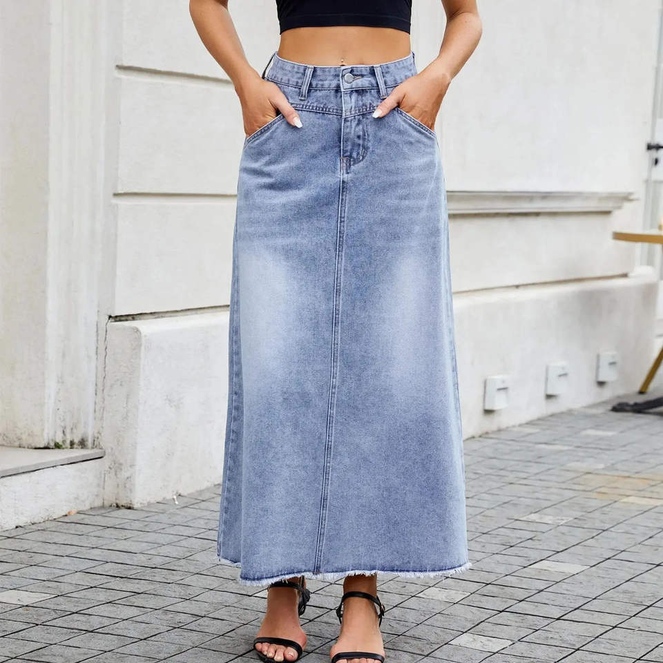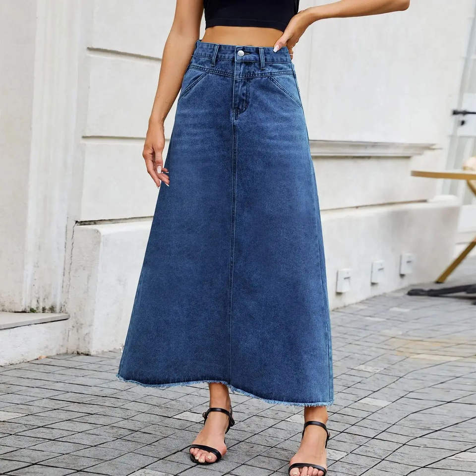 กระโปรงยีนส์ผู้หญิงคุณภาพสูง 100% ผ้าฝ้าย สไตล์ลำลอง สำหรับฤดูใบไม้ร่วง ติดกระดุม เอวสูง เนื้อผ้านุ่ม สวมใส่สบาย ใช้งานได้หลากหลาย แฟชั่นสตรีทแวร์