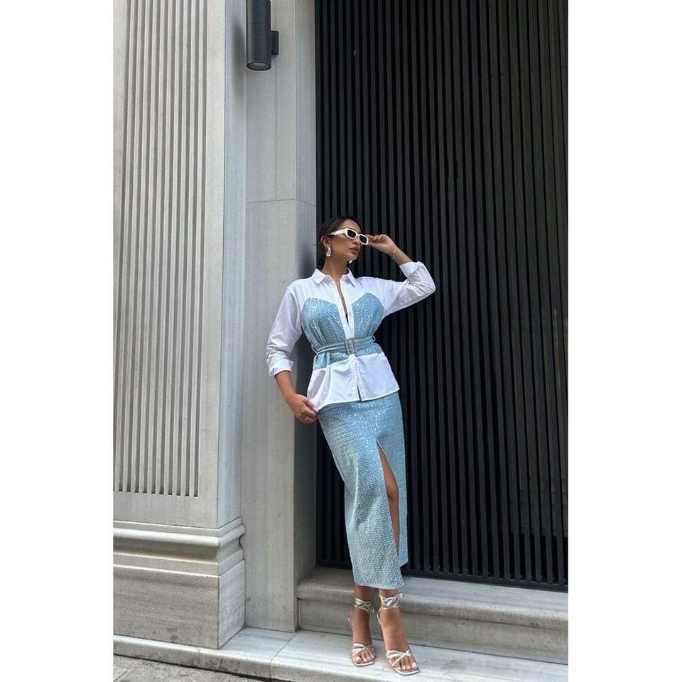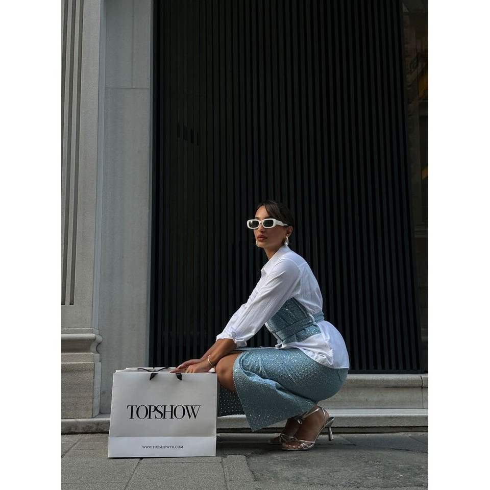 กระโปรงยีนส์ผู้หญิง TOPSHOW สีน้ำเงิน แต่งเลื่อม ดีไซน์สวย พร้อมขายส่ง