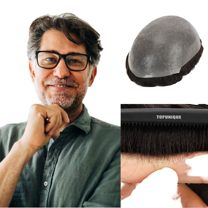 ระบบเปลี่ยนเส้นผมปลอมแบบผูกปมเดียวสำหรับผู้ชาย TUS02 Topunique เส้นผมธรรมชาติแบบมองไม่เห็นมีความทนทานทำจากหนัง PU