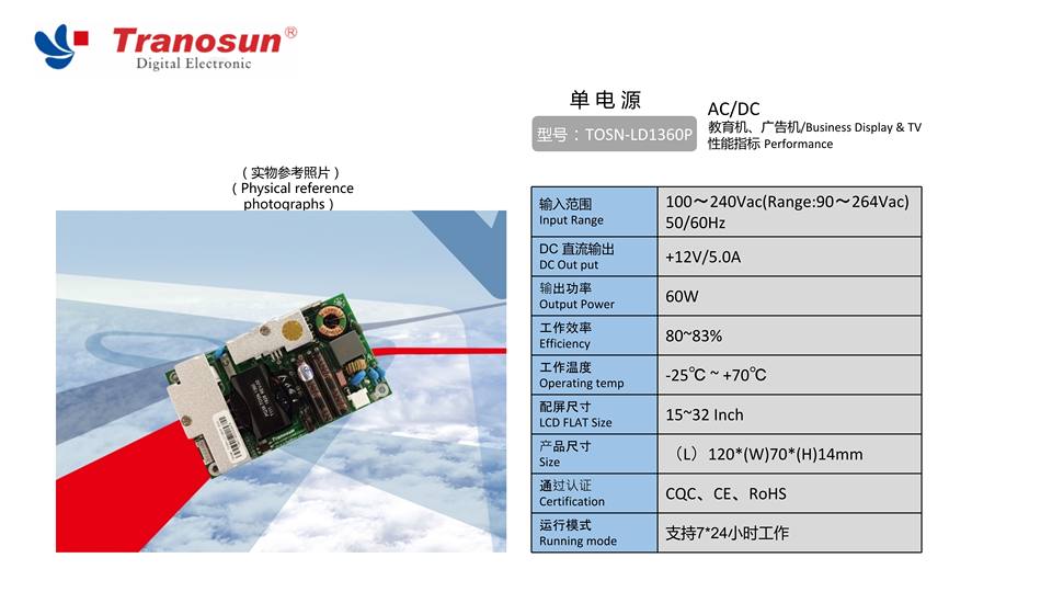 TOSN-LD1360P แหล่งจ่ายไฟสำหรับการแสดงผลทางธุรกิจทีวี60W 12V 5.0A AC DC สำหรับ15 ~ 32นิ้วจอแสดงผล CQC CE ROHS ได้รับการรับรอง110V/200V