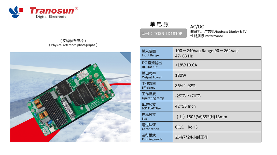 TOSN-LD1810P ใช้ได้กับแหล่งจ่ายไฟเดี่ยว180W 18V 10A 42 "-55" CCTV 500W DC เอาต์พุต500Hz 110V